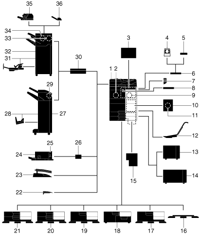 35 | Post Inserter PI-507 | Install this unit onto the Finisher FS-540/FS-540 SD. This unit inserts cover paper between the copied or printed sheets. The finisher can also be operated manually (only the lower tray is available). |