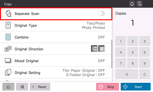 Si el número de hojas de originales es tan elevado que no pueden cargarse en el ADF al mismo tiempo, puede cargarlos en varios lotes y tratarlos como una sola tarea. También puede escanear el original utilizando alternativamente el ADF y el Cristal de originales.