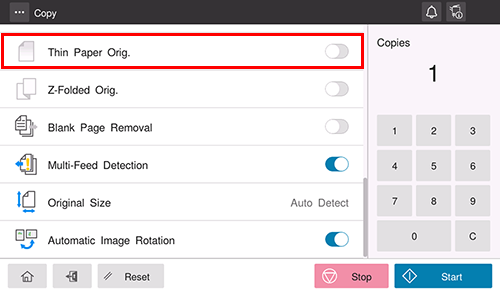 Para escanear un original más fino que el papel normal en el ADF, active esta opción. Esta función reduce la velocidad de alimentación del original del ADF para evitar que el papel fino quede atrapado.
