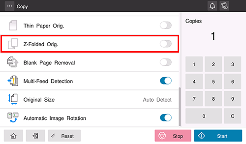 Si se carga un original plegado en el ADF, es posible que el tamaño del original no pueda detectarse con precisión. Para escanear el original plegado en el ADF, active esta opción.