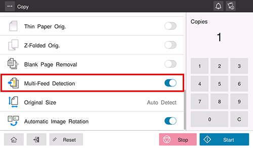 Si [Detección alimentación múltiple] está ajustado a ON, se detendrá el escaneado si la máquina detecta que el original está multiplicado en el ADF.