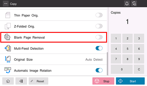 Si se especifica [Eliminar de páginas en blanco] para escanear mediante ADF un original que incluya páginas en blanco, las páginas en blanco se excluirán de los destinos de escaneado. Las páginas en blanco detectadas no se cuentan como páginas del original.