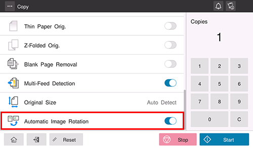 En el uso general, la máquina gira automáticamente la imagen original según la dirección del papel para realizar una copia. Si desactiva [Rotación imagen automática] según sea necesario, podrá realizar una copia sin girar la imagen original. Esta función está disponible cuando se desea copiar solamente una parte del original.