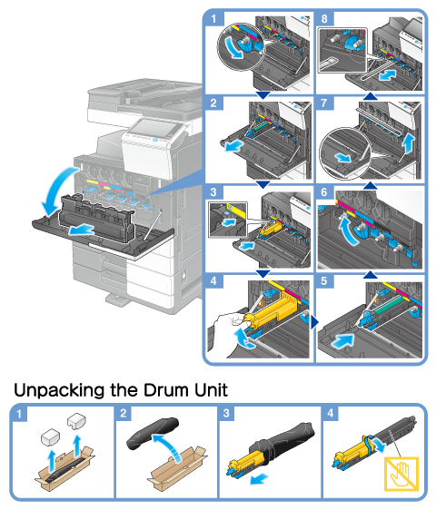 • After replacing a Drum Unit, be sure to clean the Print Head Glass for each color. For details on how to clean the Print Head Glass, refer to Here.