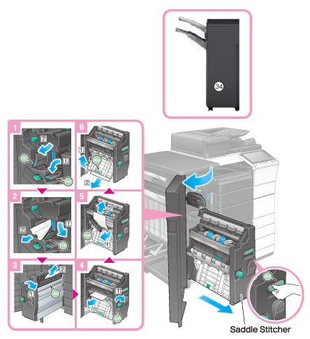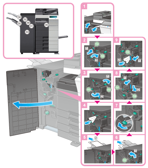 Sections inside the finisher prone to paper jams vary depending on the settings for [Finishing].