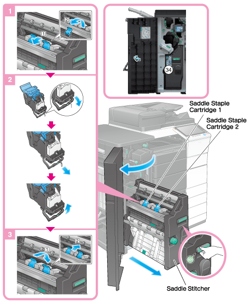 When moving the Saddle Stitcher, be sure to only hold the handle. Otherwise, your hand or finger may get caught in the machine.