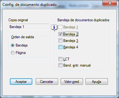 [Bandeja de documentos duplicados] | Seleccione la bandeja de papel para los duplicados. Seleccione las casillas de verificación de todas las bandejas de papel que se van a utilizar. |