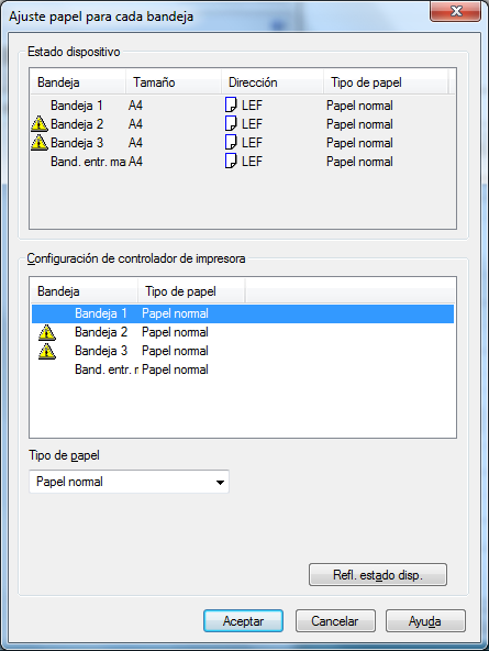 Si la opción [Ajustes de papel para cada bandeja] está activada en la pestaña de [Ajustes] del controlador de impresora, seleccione [Ajustes de papel para cada bandeja...] en la pestaña [Básico], y especifique el tipo de papel para cada bandeja.