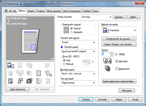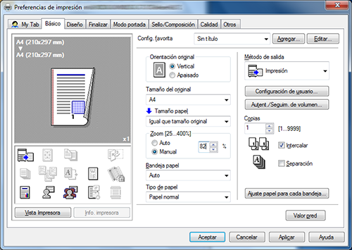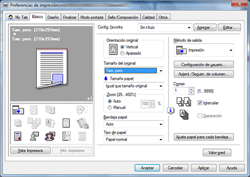 En [Tamaño papel] en la ficha [Básico], seleccione el tamaño de papel que debe utilizarse para la impresión. El porcentaje de escala se determina de forma automática por los tamaños de papel seleccionados en [Tamaño del original] y [Tamaño papel].