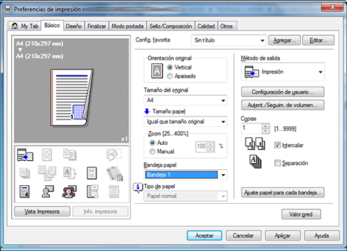 En [Bandeja papel], en la ficha [Básico], seleccione la bandeja de papel para imprimir el original.