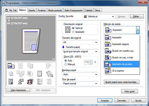 1. En [Método de salida] en la ficha [Básico], seleccione [Impresión de prueba].