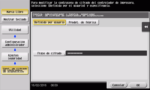 Para cambiar la contraseña de cifrado, es necesario ajustar la misma frase de cifrado en esta máquina y en el controlador de impresora.