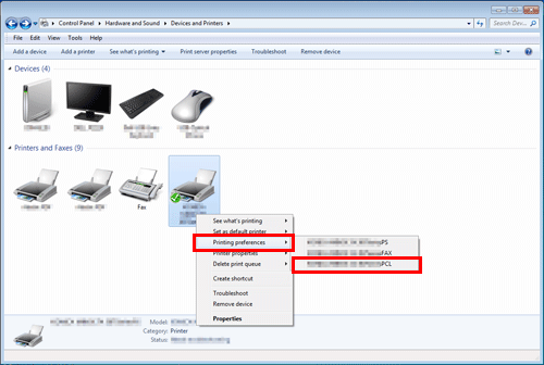 En Windows 7/8.1/10/Server 2008 R2/Server 2012/Server 2012 R2/Server 2016, haga clic con el botón derecho en el icono de la impresora instalada y, en [Preferencias de impresión], haga clic en el nombre de impresora que se muestra.