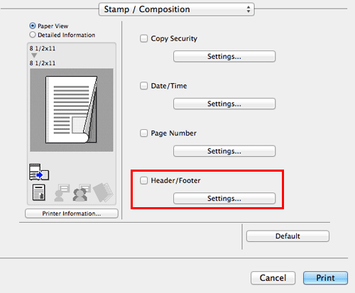 En [Stamp / Composition], seleccione la casilla de verificación [Header/Footer] y, a continuación, haga clic en [Settings...]