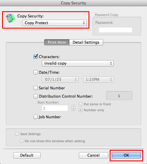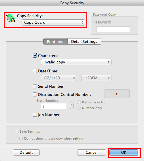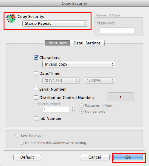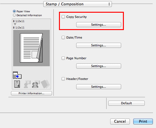 En [Stamp / Composition], seleccione la casilla de verificación [Copy Security] y, a continuación, haga clic en [Settings...]