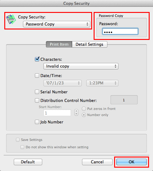 Seleccione [Password Copy], introduzca la contraseña que deba incrustarse (utilizando ocho caracteres como máximo) y, a continuación, haga clic en [OK].