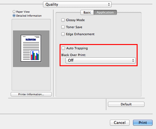 En [Quality], seleccione la casilla de verificación [Auto Trapping] o configure el ajuste [Black Over Print:].