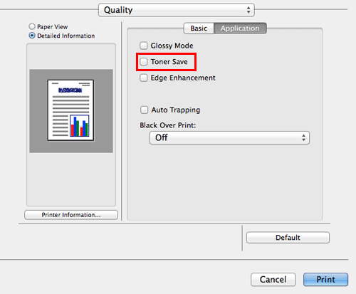 Al seleccionar la casilla de verificación [Toner Save] en [Quality], se ajusta la densidad de impresión para reducir el consumo de tóner.