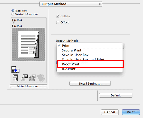 En [Output Method:], en la ventana [Output Method], seleccione [Proof Print].
