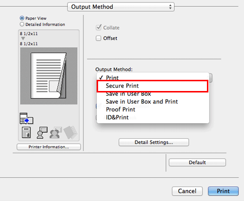 En [Output Method:], en la ventana [Output Method], seleccione [Secure Print].
