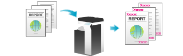 El texto como, por ejemplo, "Conteste" y "No copiar" se imprime en la primera página o en todas las páginas. Es posible seleccionar el texto que se debe añadir desde los sellos fijos registrados y los sellos registrados arbitrarios.
