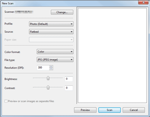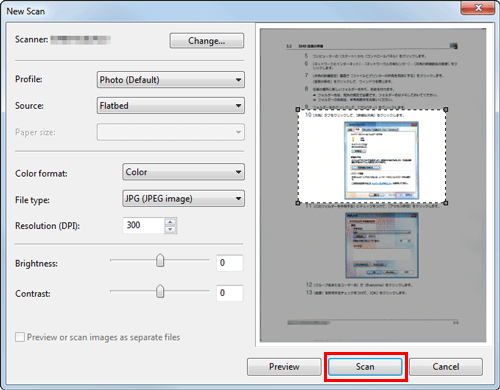 Si es necesario, recorte una imagen visualizada o ajuste el [Brillo], el [Contraste] o la [Resolución (ppp)]. Tras revisar el original escaneado, haga clic en [Escan.]