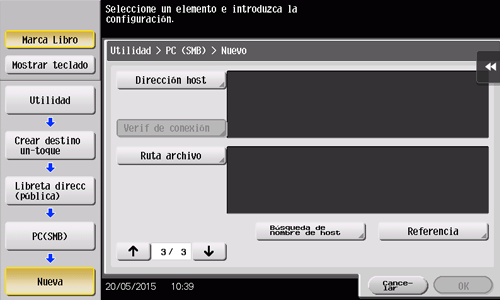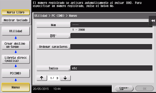 Toque [Utilidad] - [Registro destino/carpeta] - [Crear destino un-toque] - [Libreta de direcciones] - [PC (SMB)] - [Nueva].