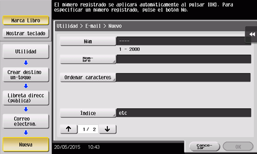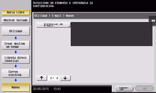 Toque [Utilidad] - [Registro destino/carpeta] - [Crear destino un-toque] - [Libreta de direcciones] - [Correo electrónico] - [Nueva].