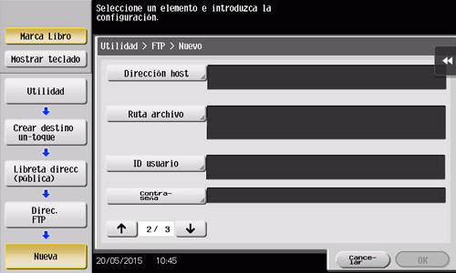 Toque [Utilidad] - [Registro destino/carpeta] - [Crear destino un-toque] - [Libreta de direcciones] - [FTP] - [Nueva].