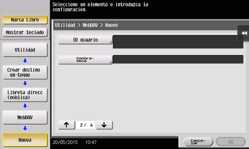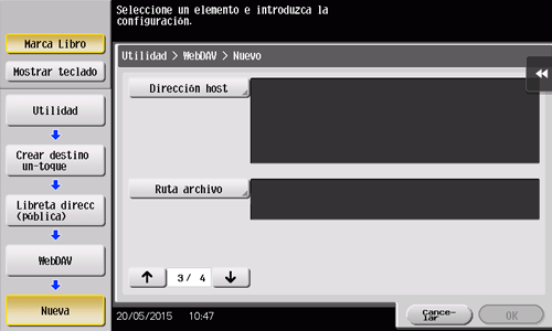 Toque [Utilidad] - [Registro destino/carpeta] - [Crear destino un-toque] - [Libreta de direcciones] - [WebDAV] - [Nueva].