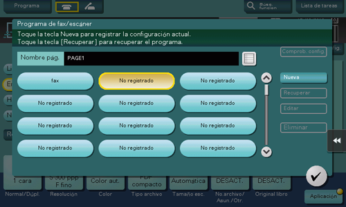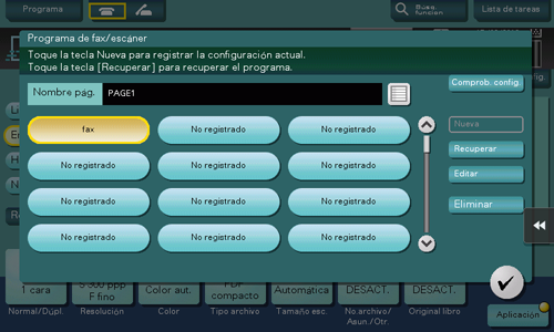 Cuando registra un programa de fax/escáner, puede recuperar la combinación de las opciones de configuración desde la pantalla principal con una sola acción del teclado. También puede incluir un destino en el registro del programa.