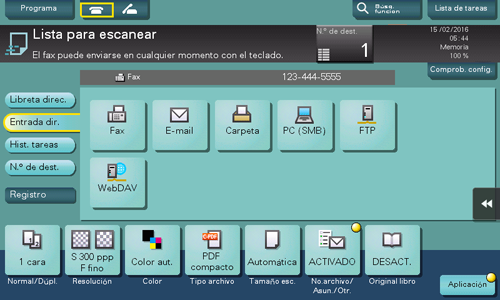 2. Toque [Entrada dir.], seleccione [Fax] y, a continuación, introduzca un número de fax.