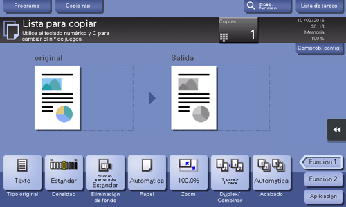 Para configurar fácilmente varios ajustes de copia, puede mostrar en una sola pantalla todos los ajustes de copia básica y disponer las teclas utilizadas con mayor frecuencia en la pantalla principal. Para obtener más información, consulte Aquí.