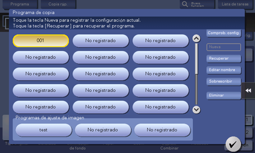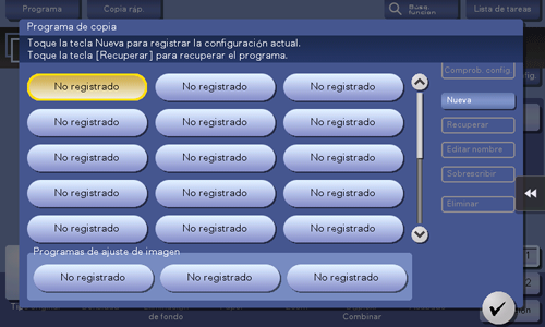 Al registrar un programa de copia, puede recuperar la combinación de diferentes ajustes de copia desde la pantalla principal mediante una acción simple.