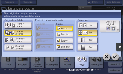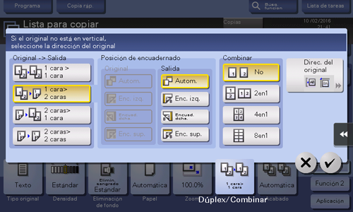 Si va a utilizar originales de 2 caras, seleccione [2 caras>1 cara] o [2 caras>2 caras]. Seleccione una tecla arbitraria según el estado del original y el resultado de la copia.