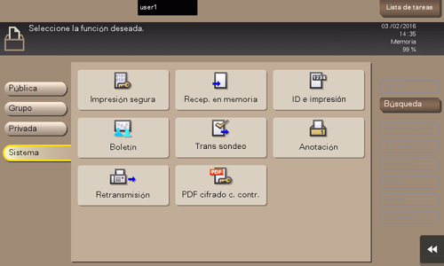 La carpeta del sistema se utiliza para que el sistema almacene de forma temporal archivos cuando el usuario utiliza las funciones de fax o de impresión junto con la función de almacenamiento de archivos de la carpeta.