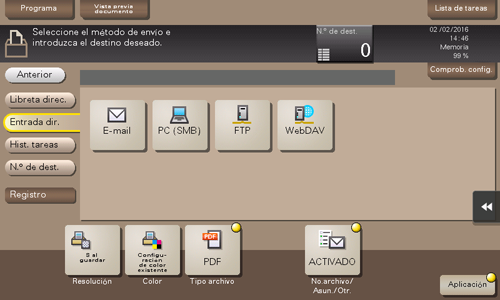 En [Entrada dir.], pulse la tecla de tipo de destino e introduzca el nombre del destino.