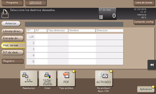 Pulse [Hist. tareas] y puede seleccionar un destino desde el historial de escáner o de tareas guardadas.