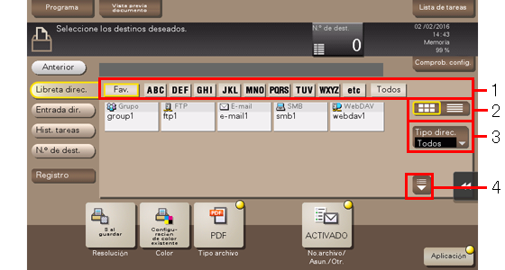 2 | Cambia la visualización de los destinos registrados al modo de vista en lista o botón. Si se selecciona el modo de vista en lista, puede clasificar los destinos por número de registro, tipo de destino o nombre registrado. |