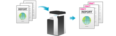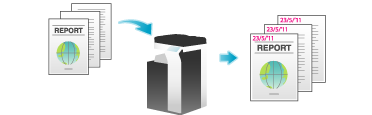 El texto como, por ejemplo, "Conteste" y "No copiar" se imprime en la primera página o en todas las páginas. Es posible seleccionar el texto que se debe añadir desde los sellos fijos registrados y los sellos registrados arbitrarios.