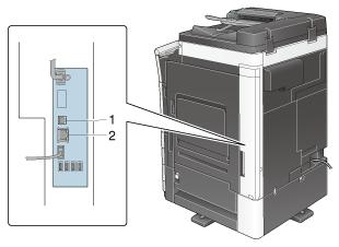 Los cables de impresora están conectados a cada puerto de esta máquina.