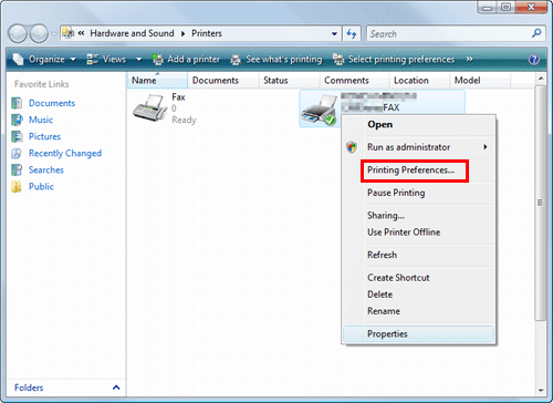 En Windows Server 2008, haga clic con el botón derecho en el icono de la impresora instalada y haga clic en [Preferencias de impresión...]