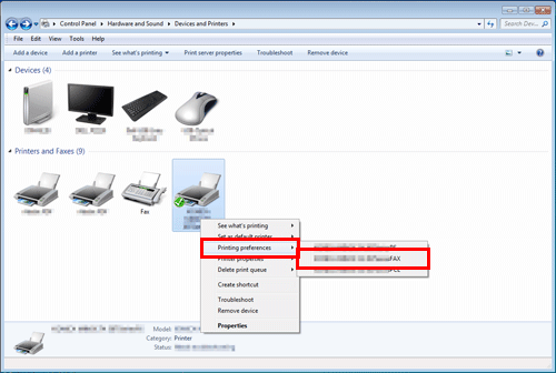 En Windows 7/8.1/10/Server 2008 R2/Server 2012/Server 2012 R2/Server 2016, haga clic con el botón derecho en el icono de la impresora instalada y, en [Preferencias de impresión], haga clic en el nombre de impresora que se muestra.