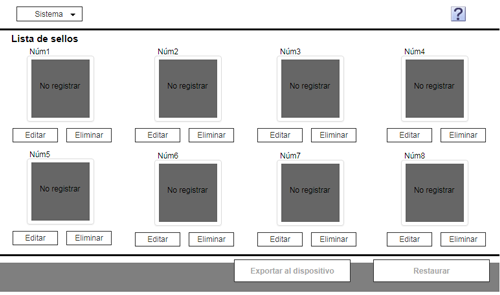 Al hacer clic en [Eliminar] se eliminan todos los datos del sello registrados. Los datos del sello no se eliminarán hasta que haga clic en [Exportar al dispositivo] y lo escriba en esta máquina.