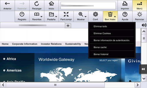 Seleccione [Menú] - [Borrar historial] en la barra de herramientas para eliminar datos web (, almacenamiento en web o base de datos indexada), datos de caché, información de autenticación y otros datos.