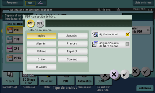 [ACT.]/[DES.] | Seleccione [ACT.] para crear un archivo PDF en el que se pueden realizar búsquedas. |