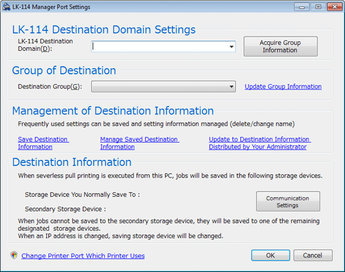 Puede cambiar el grupo de Serverless Pull Printing de destino en función de la ubicación en la que desee realizar la impresión Serverless Pull Printing. Para ello, guarde la información de destino por medio de LK-114_ManagerPort.