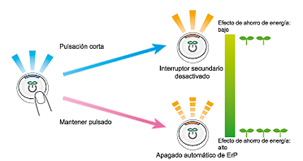 Mantener pulsado | Interruptor secundario desactivado | Encendido: Naranja | El efecto de ahorro de energía es el mismo que en el modo inactivo. Mientras la alimentación secundaria esté desconectada, esta máquina puede recibir datos o faxes, sin embargo, no puede escanear ni imprimir un original. Si se reciben datos o faxes mientras el interruptor secundario esté desconectado, se imprimen cuando la máquina regresa al modo normal. Para permitir que la máquina regrese al modo normal desde el estado de interruptor secundario desactivado, pulse nuevamente la tecla Energía. |