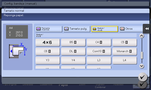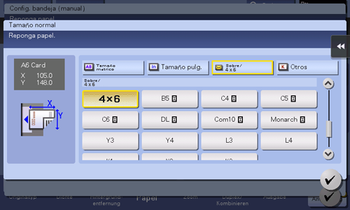 Toque [Sobre/4 6] ([Sobre/tarj.A6]) en [Tamaño de papel].