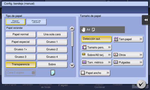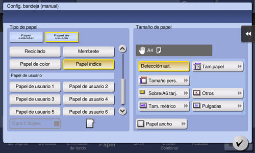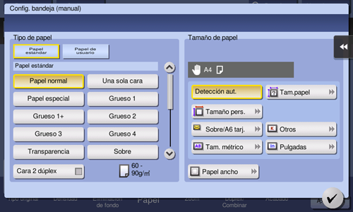 Aparece la pantalla de selección del tamaño y del tipo de papel.